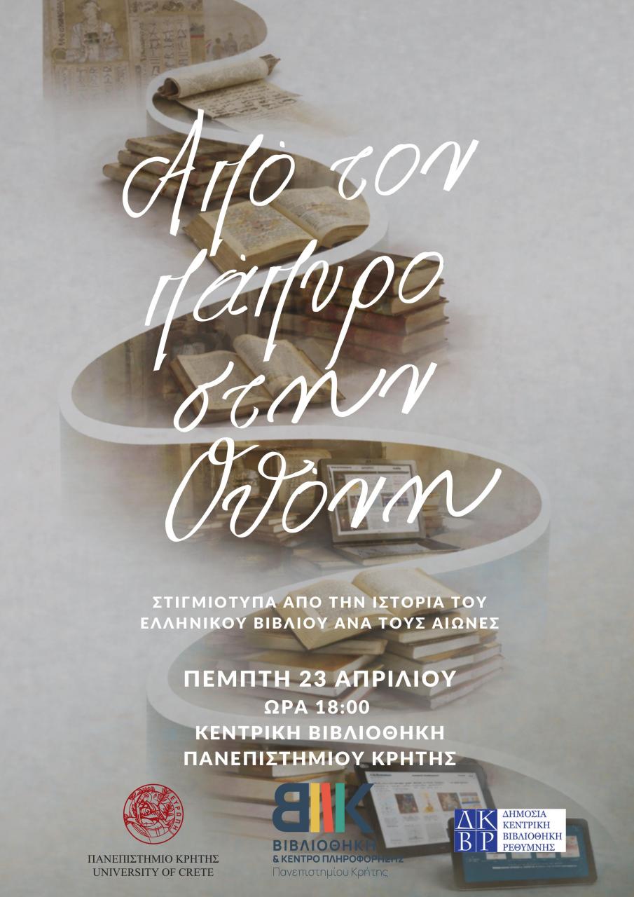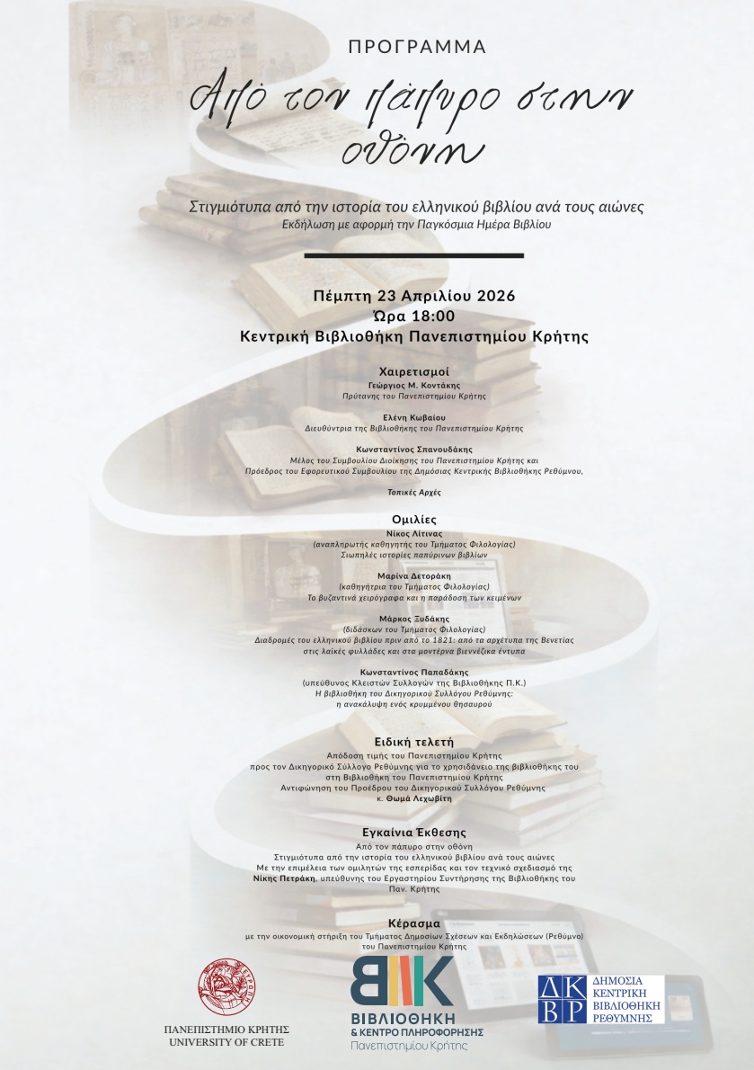 Την Πέμπτη, 23 Απριλίου 2026, και ώρα 18:00 μ.μ., στην Κεντρική Βιβλιοθήκη του Πανεπιστημίου Κρήτης, με αφορμή την Παγκόσμια Ημέρα Βιβλίου, τιμάται από το Πανεπιστήμιο Κρήτης, ο Δικηγορικός Σύλλογος Ρεθύμνου για το χρησιδάνειο της Βιβλιοθήκης του στη Βιβλιοθήκη του Πανεπιστημίου Κρήτης.